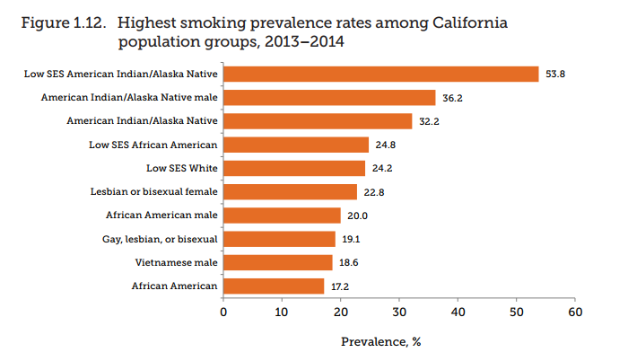 By looking at this graph, it is clear that the people who suffer most from tobacco addiction are Native Americans with a low socioeconomic status, followed by all Native Americans. Because of this evidence, the California Public Health Department can design and implement cessation programs that specifically target areas with large numbers of Native Americans.