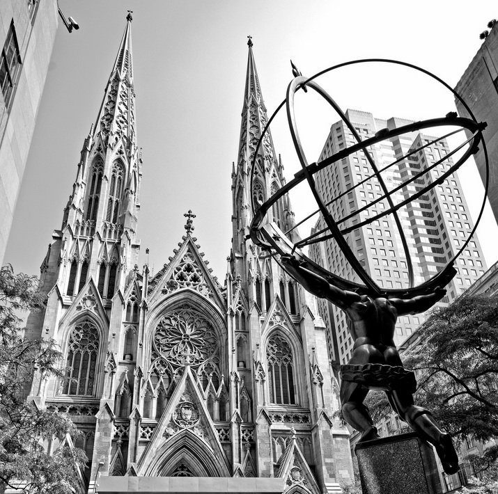 You have two completely opposing philosophies facing each other across 5th Ave. On one side there is a beautiful Church: a symbol of hope and comfort for the poor and needy, a place with open doors to a large parish from all walks of life. On the other side lies a grand bronze statue that embodies power, and dominion; it sits as a symbol that resonates with the wealthy and powerful. What is the truth about life? How does strength manifest itself? I think both questions are interconnected, and the two opposing entities that exist there on 5th Ave. tell two different stories.