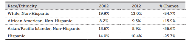 Meanwhile, we have no idea what the smoking rate is for Middle Easterners and North Africans. I would imagine that it’s pretty high, given the wide cultural acceptance of hookah and other smoking products. However, in this graph, we are lumped in with the rest of the white population, simultaneously skewing results for white demographics without our presence being recognized.